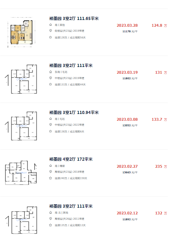 更引人注目的是,在交付的这一年中,裕墨园小区卖出的二手房价格基本上都在1.2万/㎡左右,洋房、叠墅的价格则更高。