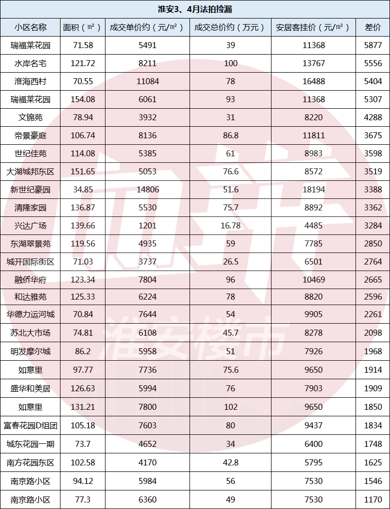 根据小编的不完全统计,3、4月份淮安法拍房市场共成交了30套左右的房源。