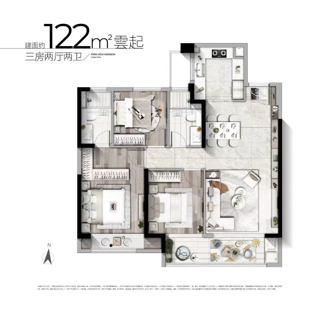 而10号楼的户型与8号楼的面积段基本类似,有两种户型,建面约122㎡和143㎡,均是3房2厅2卫的设计。