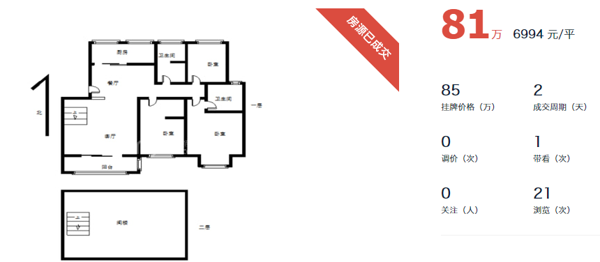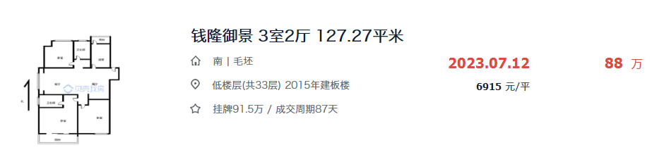 再来看看这套房源,不得不佩服房东的决心,起始阶段就挂了偏低的价格,总价85万,带看一次,降了4万元,只用了2天就成交!
