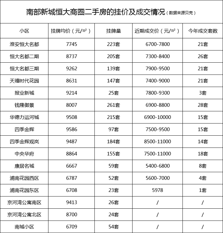 小编统计了南部新城中小区最集中、人口最密集恒大商圈的二手房情况。