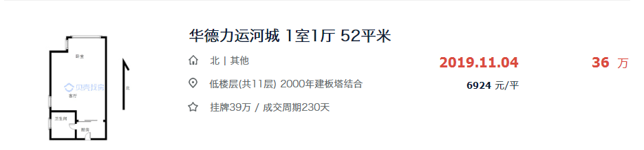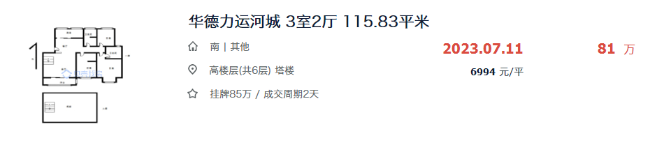 近日,小编在翻看贝壳网淮安7月份二手房的成交数据时发现:南部新城的华德力运河城,成交了一套建面约115.83㎡的房源,总价仅81万,折合成交单价才6994元/㎡!